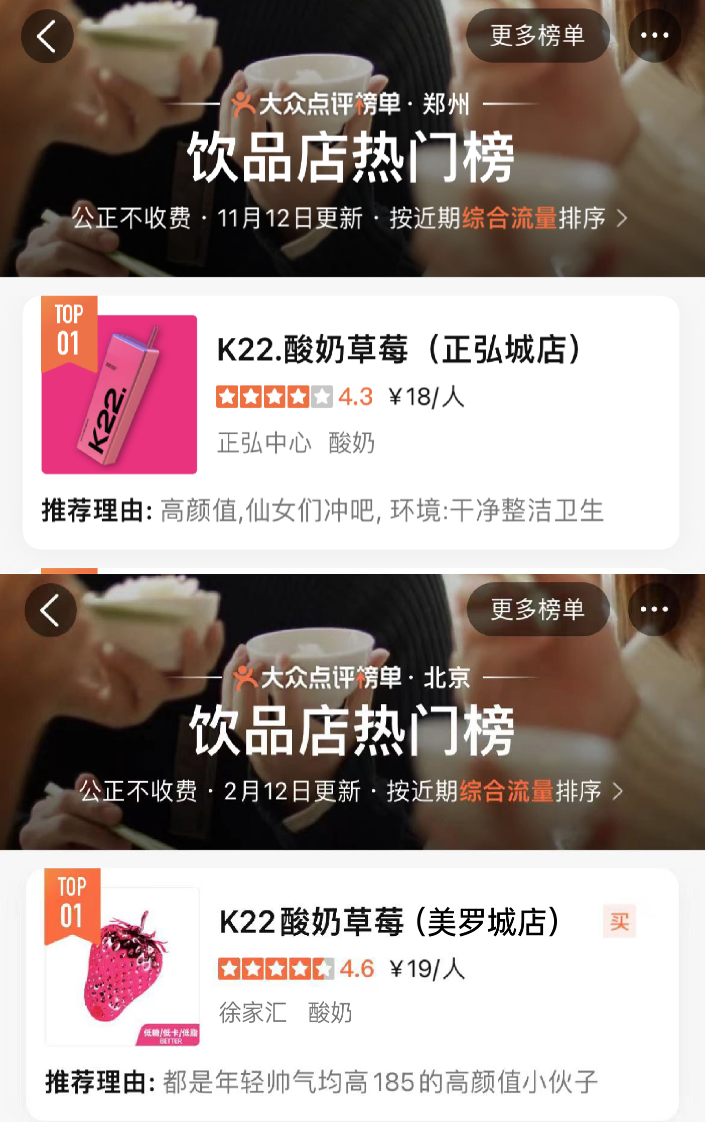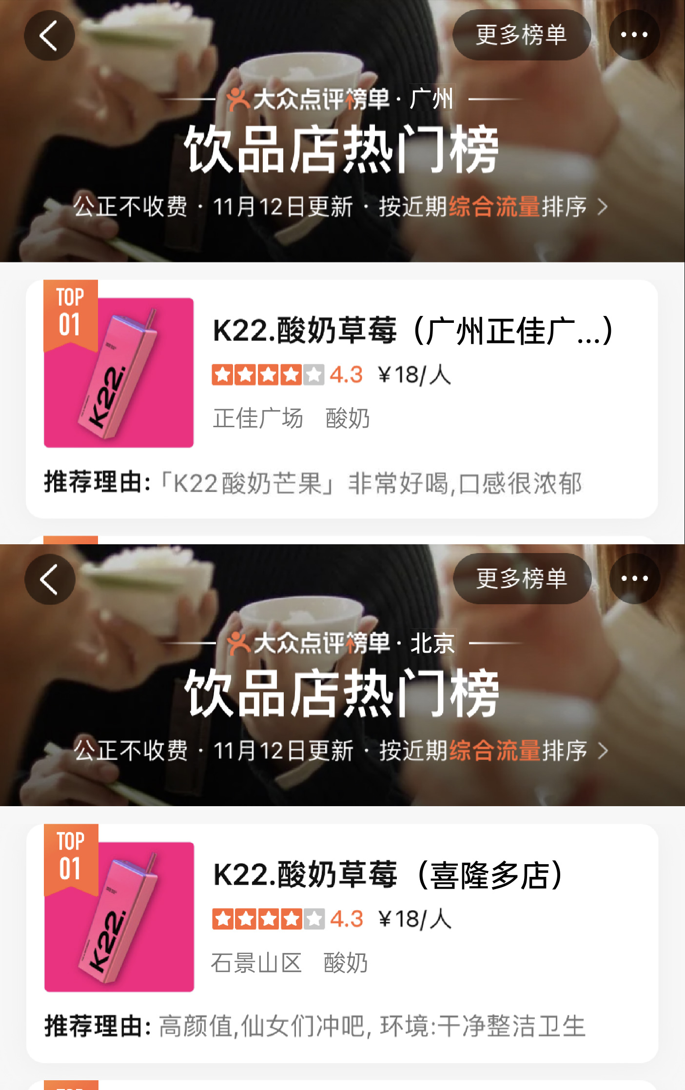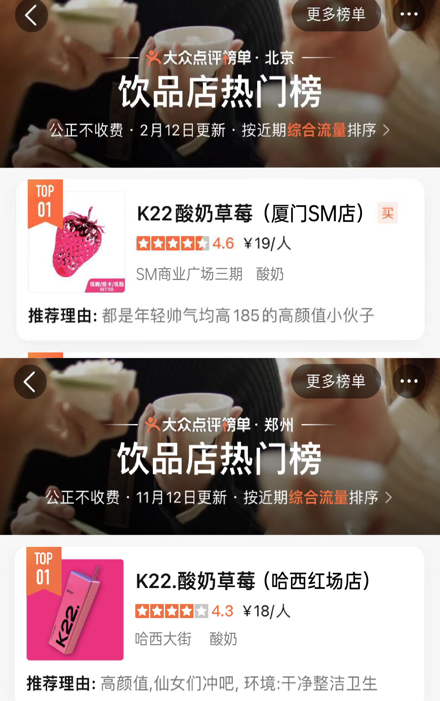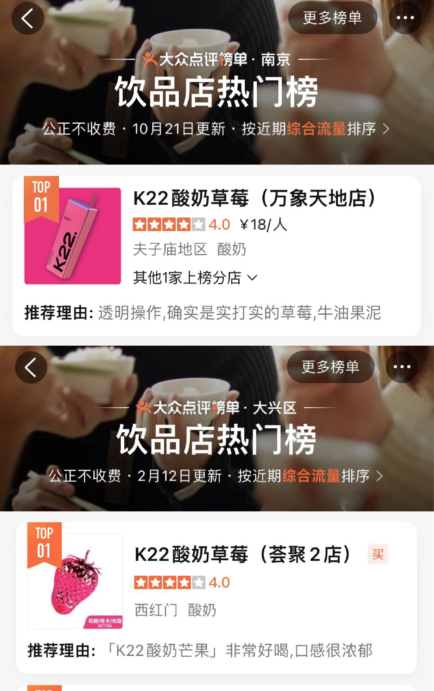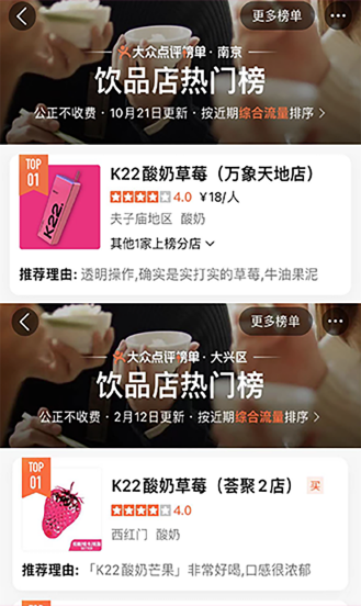 K22凭独特且专属的粉色与大方杯的品牌标识加上高品质产品而广受好评,深受广大消费者的喜爱。曾在0宣传情况下登上北京市/南京市/郑州市/无锡市/长春市/南宁市哈尔滨市饮品热门榜第一名。