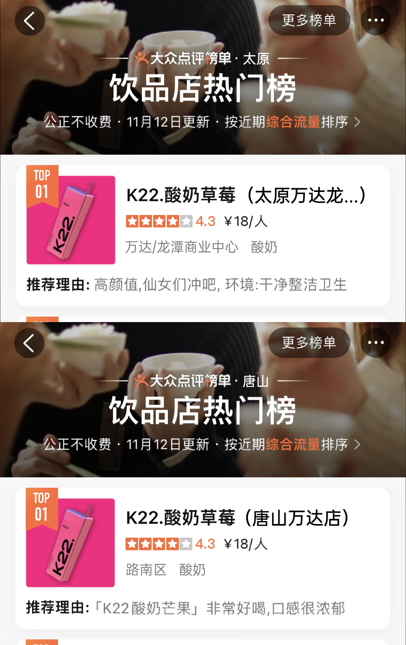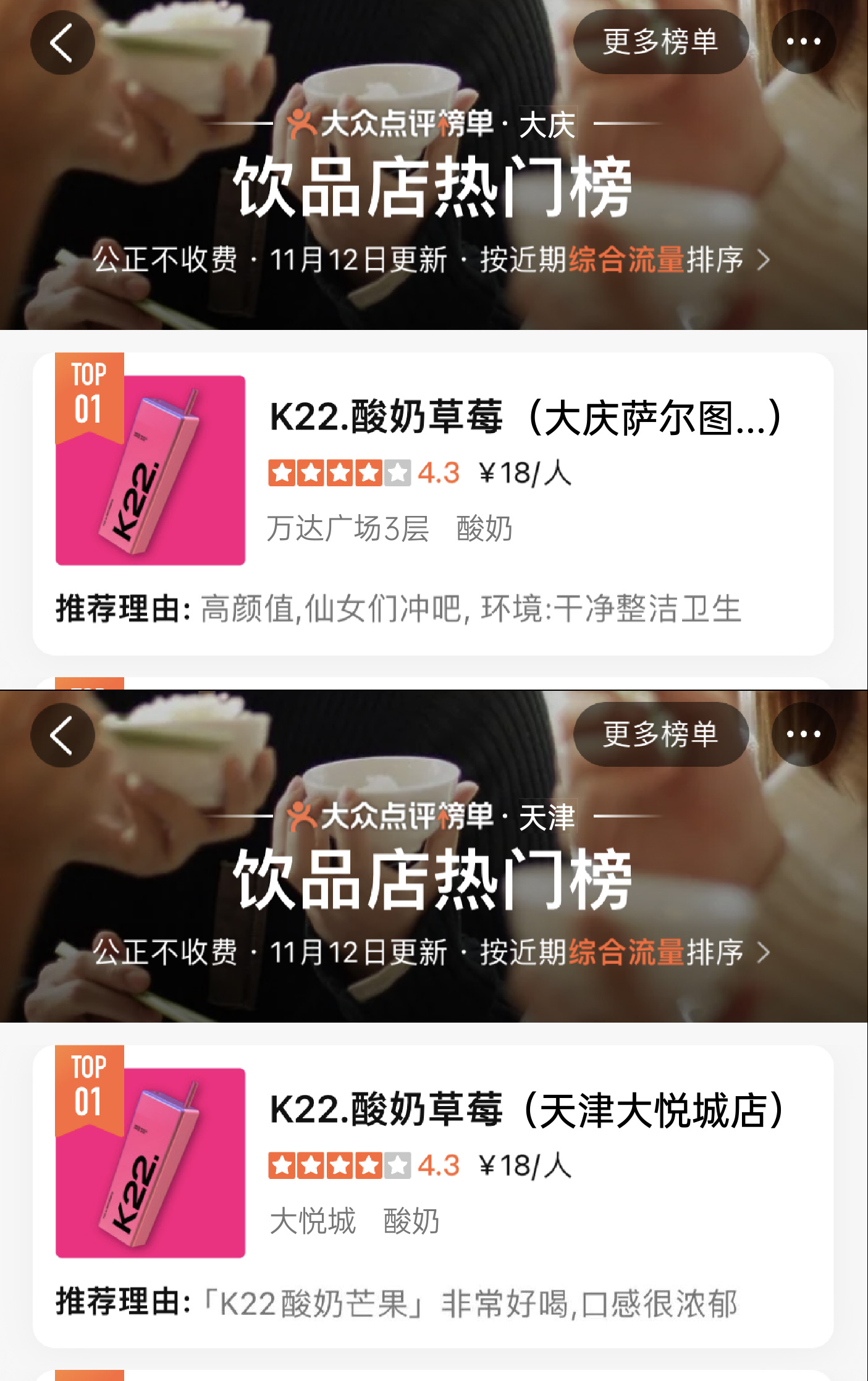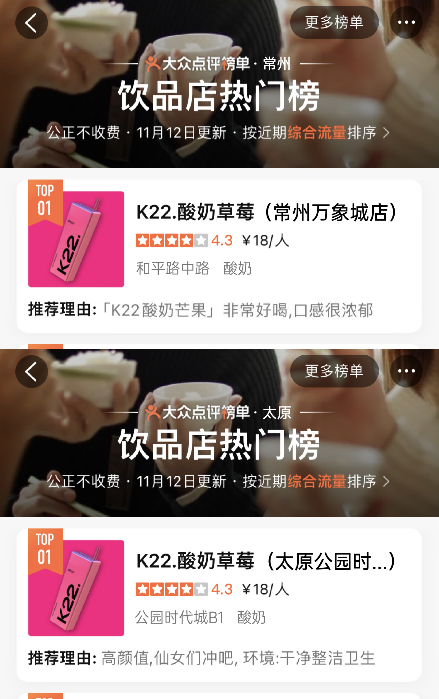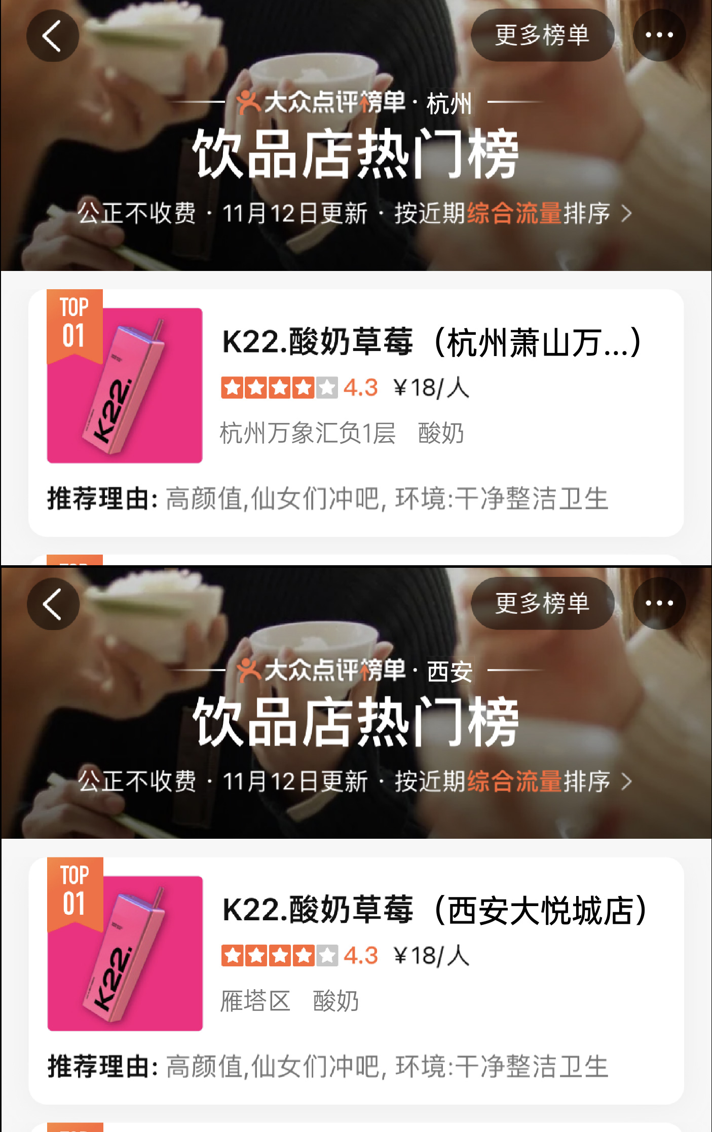K22凭独特且专属的粉色与大方杯的品牌标识加上高品质产品而广受好评,深受广大消费者的喜爱。曾在0宣传情况下登上北京市/南京市/郑州市/无锡市/长春市/南宁市哈尔滨市饮品热门榜第一名。